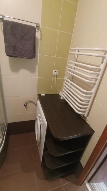 Łazienka: szafka, kabina prysznicowa, pralka, WC