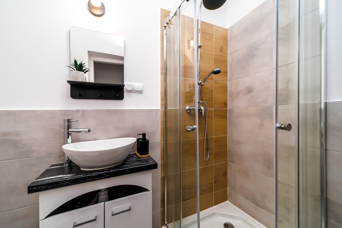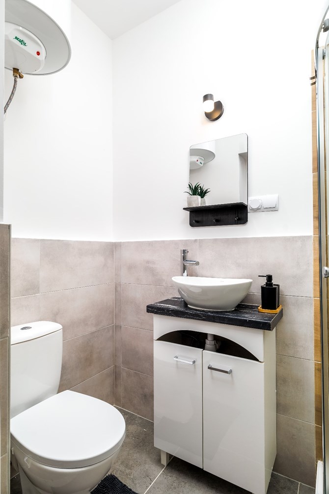 Łazienka z WC: prysznic, umywalka, lustro, bojler
