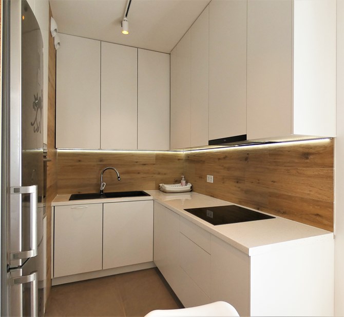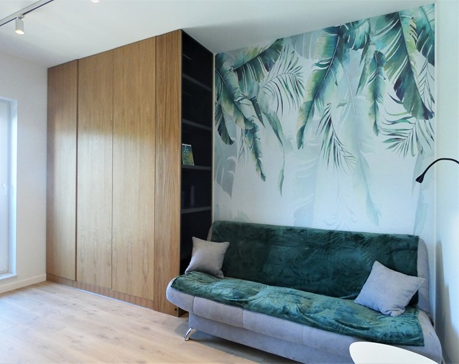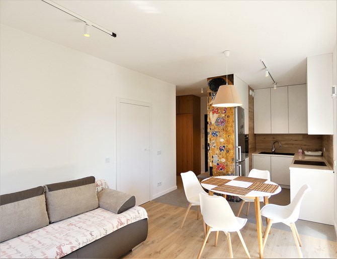 Pokój z aneksem kuchennym: szafki, lodówka, czteropalnikowa płyta indukcyjna, zmywarka, zlewozmywak, piekarnik, stół z krzesłami, rozkładana sofa, komoda.