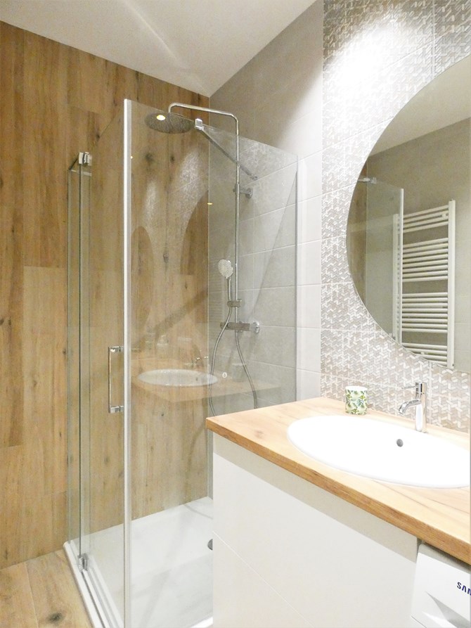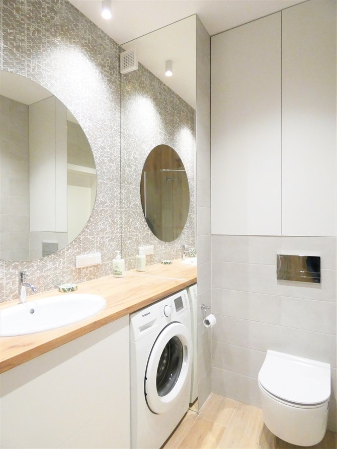 Łazienka: kabina prysznicowa, WC, pralka, lustro z półką.