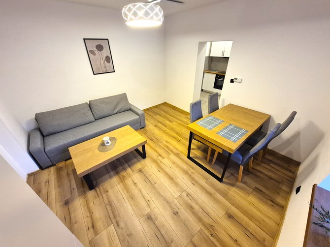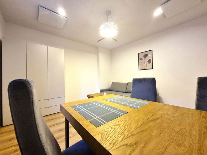 Pokój: kanapa rozkładana, stół, krzesła , komoda, szafa, stolik kawowy.