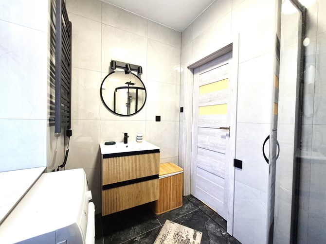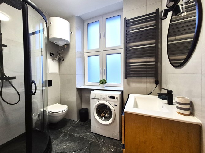 Łazienka z WC: kabina prysznicowa, umywalka, szafka, lustro, pralka.
