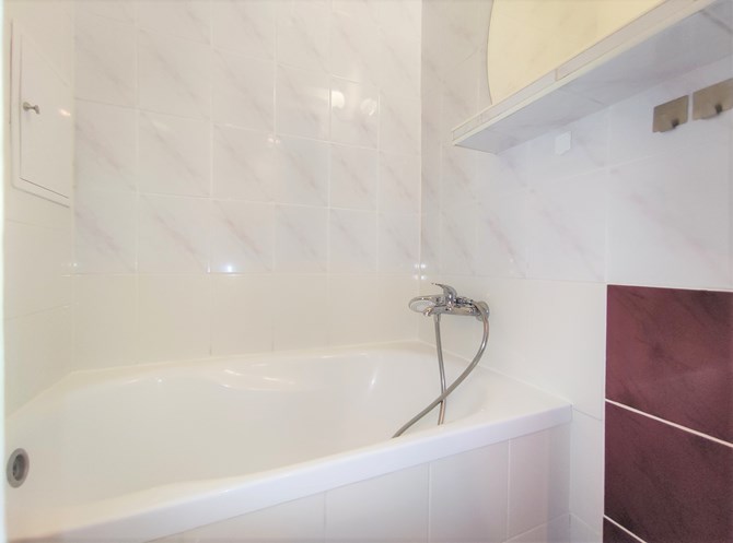 W łazience: wanna, lustro oraz WC.