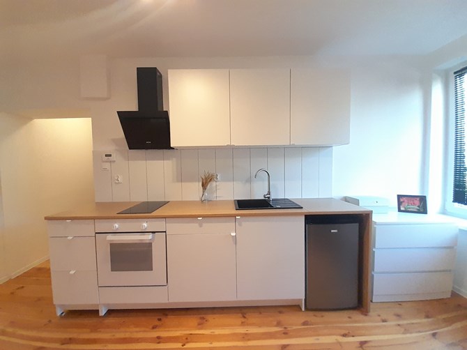 Aneks kuchenny: szafki, płyta elektryczna, piekarnik, lodówka.
