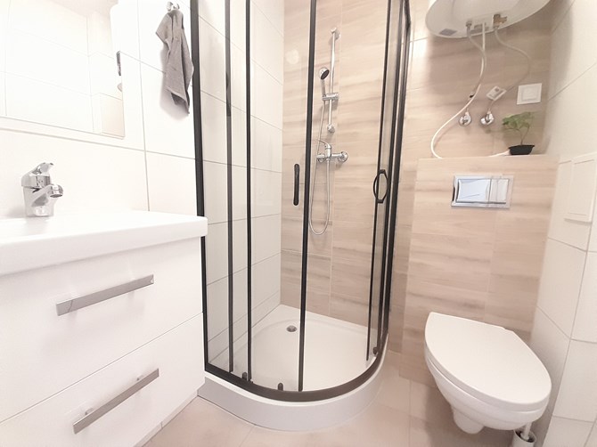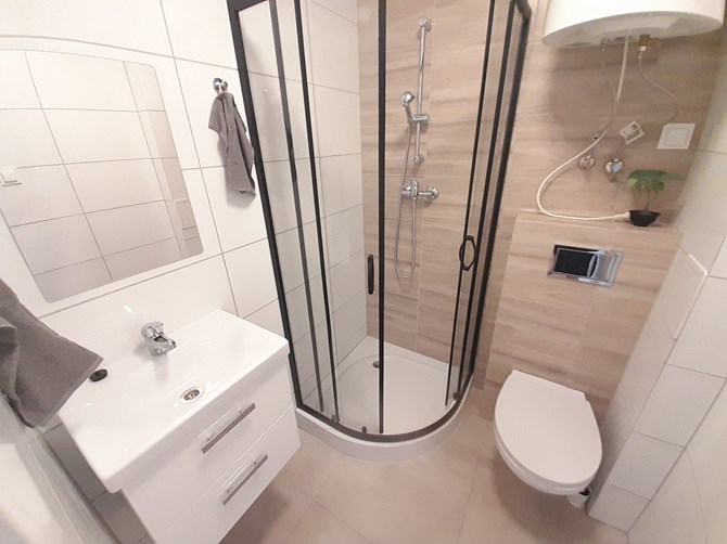Łazienka: kabina prysznicowa, umywalka, szafka, lustro, WC.