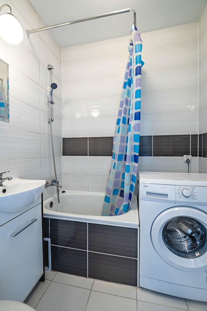 Łazienka: prysznic, pralka, umywalka z szafką oraz WC.