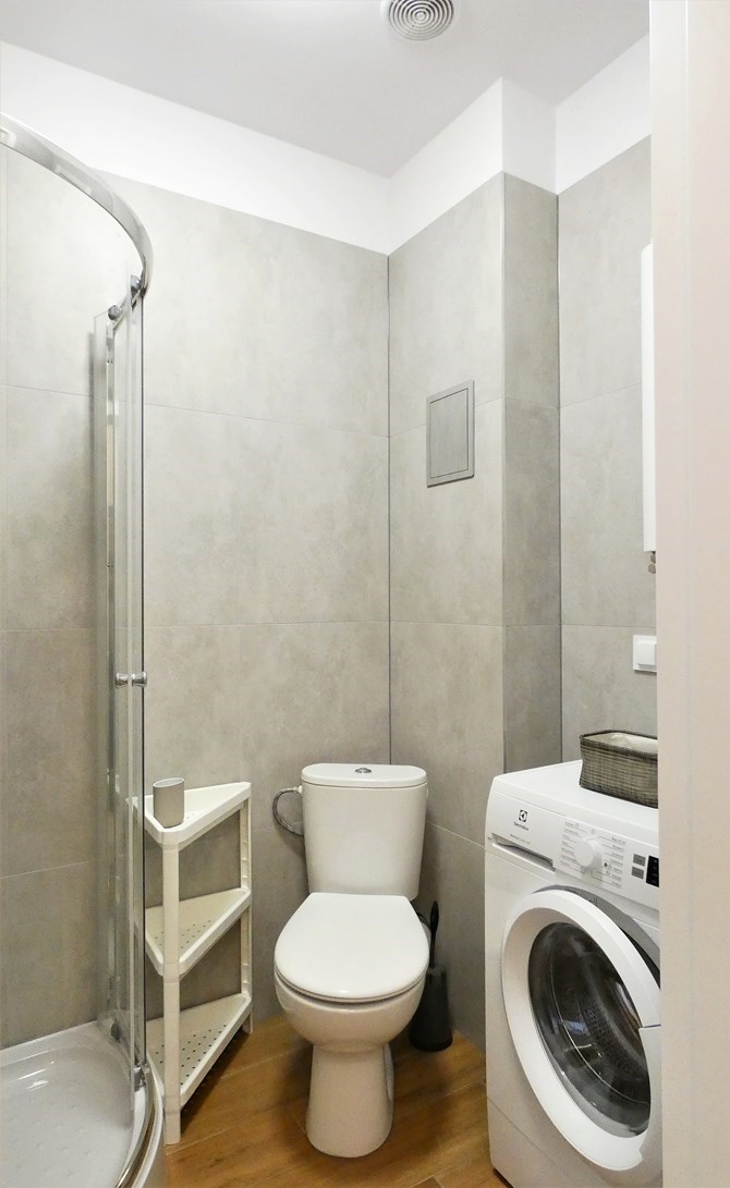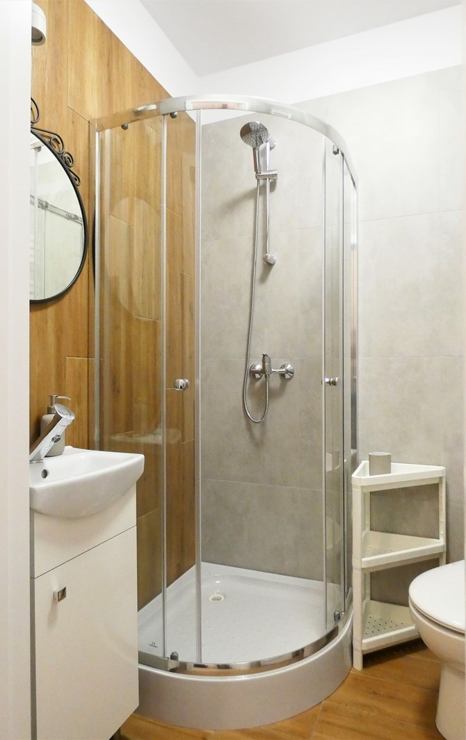 Łazienka razem z WC: kabina prysznicowa, lustro z umywalką.