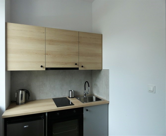 Pokój z aneksem: szafki wiszące i stojące, łóżko, komoda, stolik, krzesło, szafa, piekarnik, lodówka, dwupalnikowa płyta indukcyjna, okap, pralka.