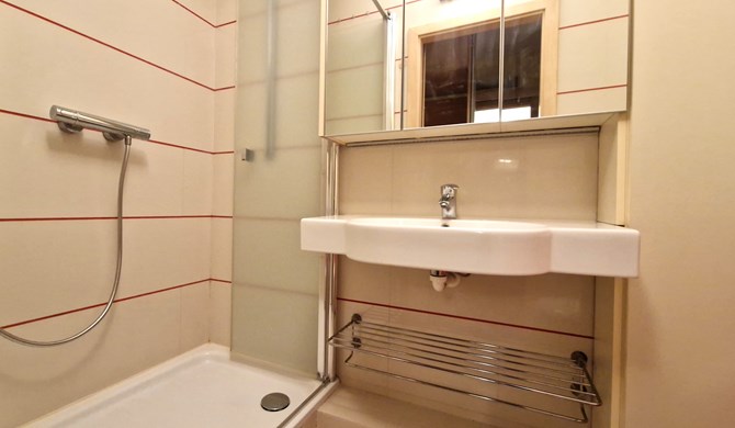 Łazienka (razem z WC): kabina prysznicowa, lustro, szafki, umywalka.
