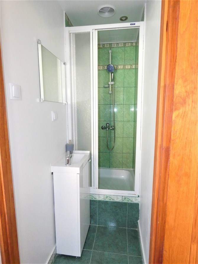 Łazienka: prysznic, umywalka, szafka, lustro.