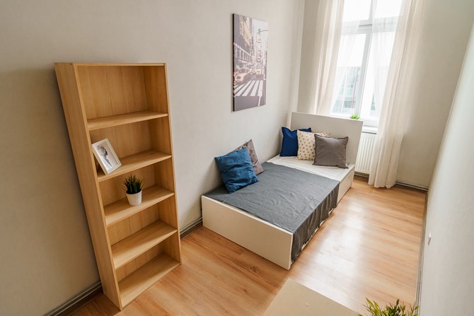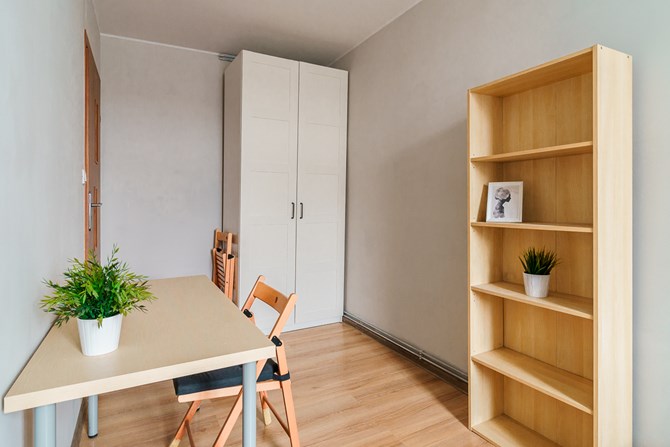 W każdym pokoju znajduje się wygodne łóżko, regał, pojemna szafa oraz biurko z dwoma krzesłami.