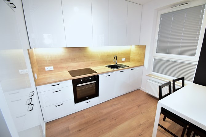 Aneks kuchenny: stół z 4 krzesłami, szafki wiszące i stojące, lodówka, czteropalnikowa płyta indukcyjna, piekarnik, zlewozmywak, zmywarka, okap. Wszystkie sprzęty w zabudowie.