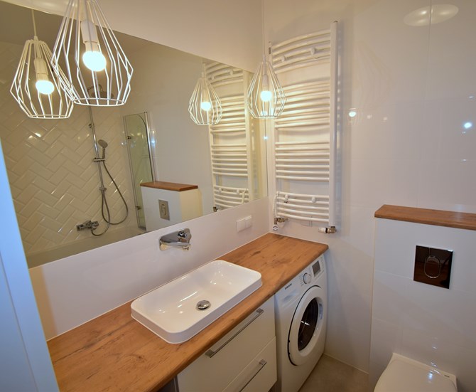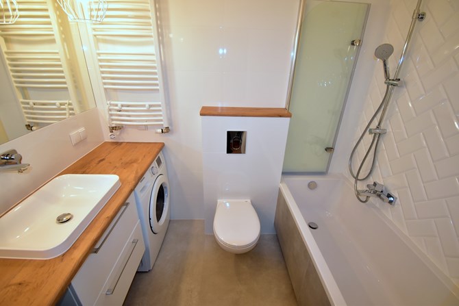 Łazienka razem z WC: lustro, szuflady, wanna, pralka, umywalka.