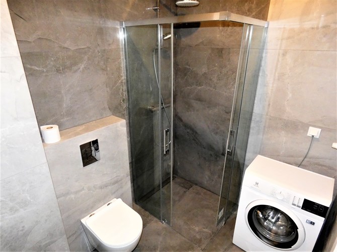 Łazienka: kabina prysznicowa, umywalka, pralka, WC.