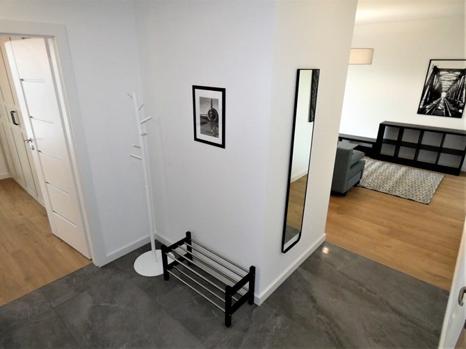 Przedpokój: wieszak, półka na buty, lustro.