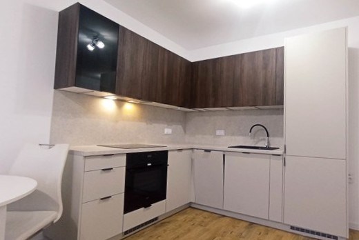 Aneks kuchenny wyposażony m.in. w zmywarkę, płytę indukcyjną, piekarnik, lodówkę w zabudowie.