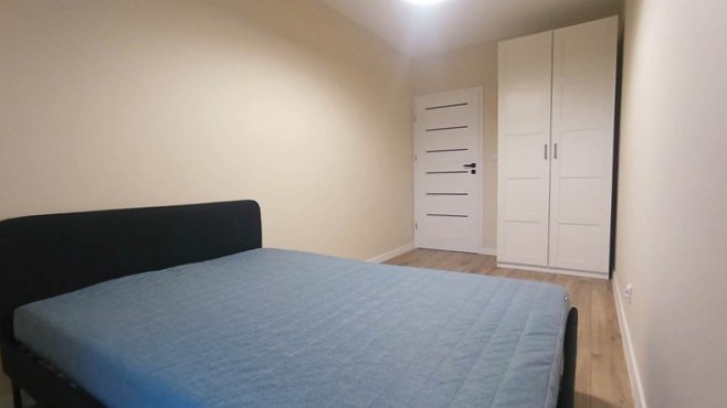 Sypialnia: duża szafa, dwuosobowe łóżko z materacem. Łazienka: kabina prysznicowa, umywalka, pralka, WC.