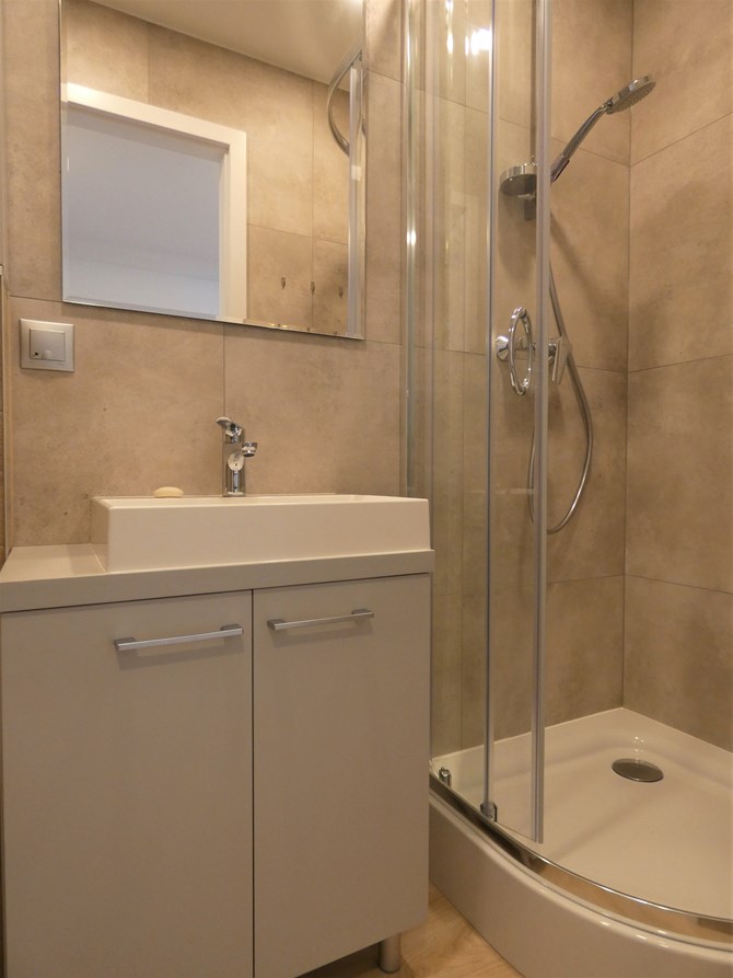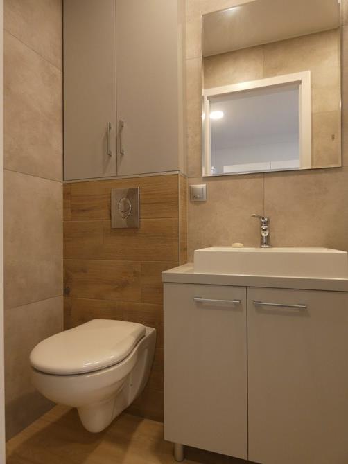 Łazienka z WC: kabina prysznicowa, umywalka z szafką, lustro.