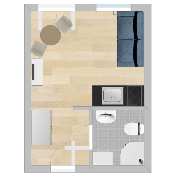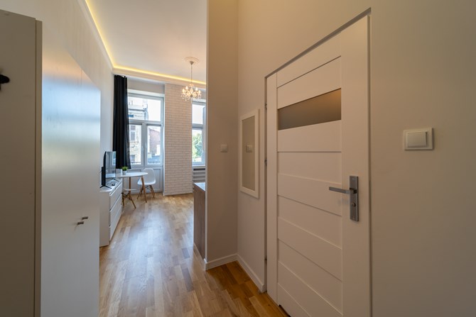 Mieszkanie składa się z pokoju z aneksem kuchennym, łazienki oraz przedpokoju.