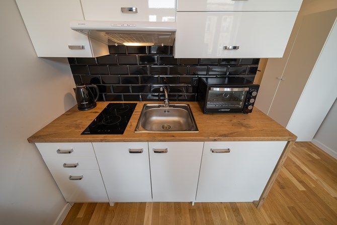 Aneks kuchenny: szafki wiszące i stojące, kuchenka dwupalnikowa, opiekacz, lodówka, zlew, okap, czajnik elektryczny.