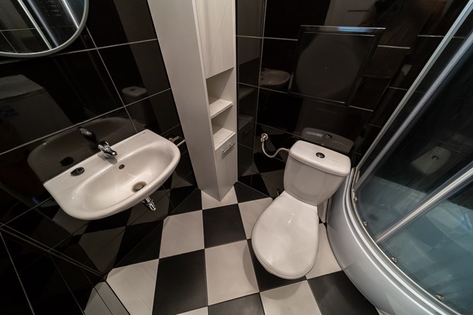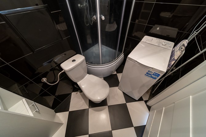 Łazienka: kabina prysznicowa, pralka, WC, umywalka, lustro, półki i szafka na przybory toaletowe.