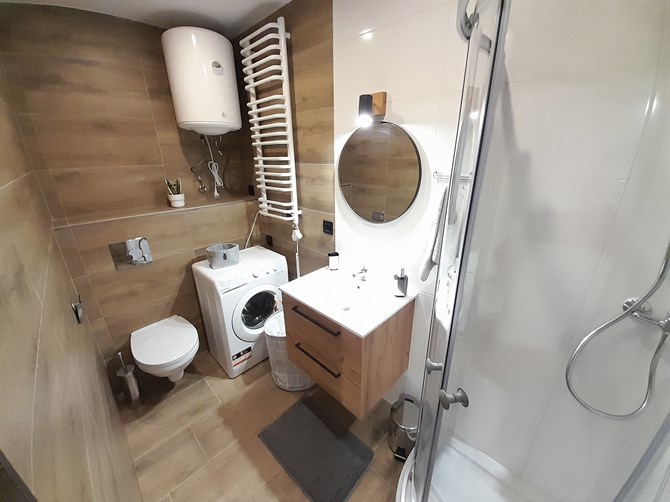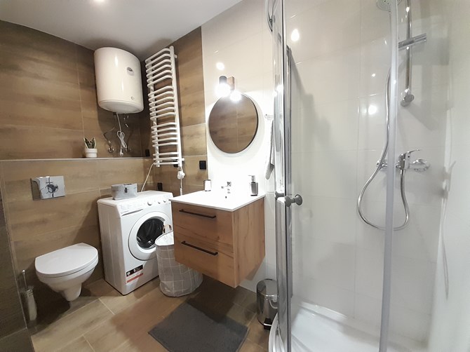 Łazienka z WC: kabina prysznicowa, umywalka, szafka, lustro, pralka.