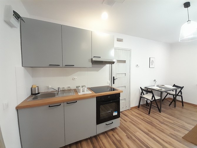 Aneks kuchenny: szafki, płyta elektryczna, piekarnik, lodówka.