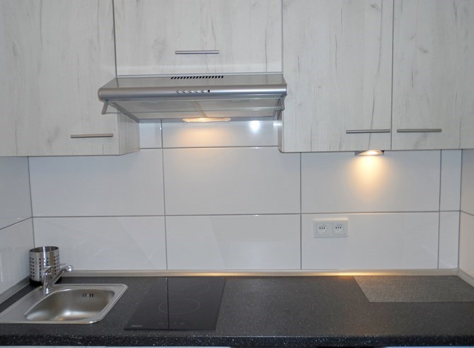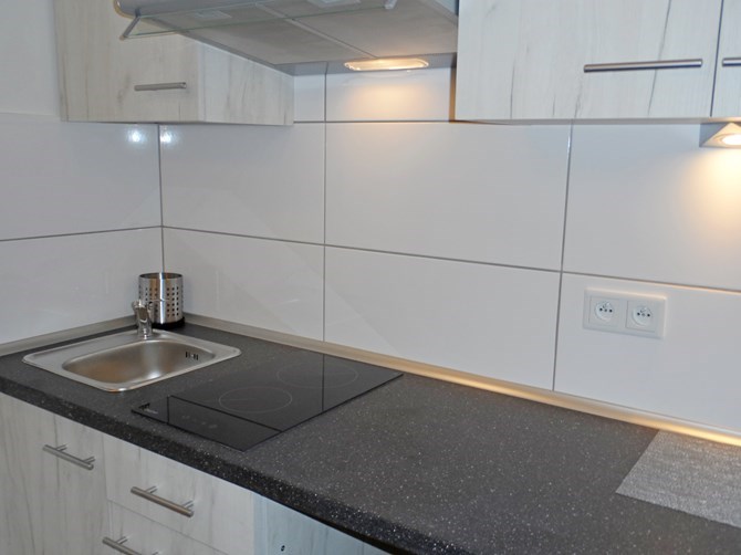 Aneks kuchenny: szafki wiszące i stojące, lodówka, dwupalnikowa płyta elektryczna, zlewozmywak, okap.