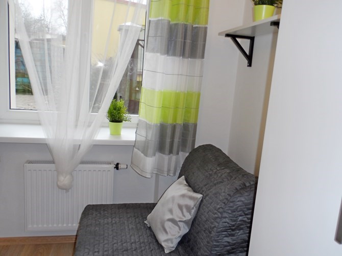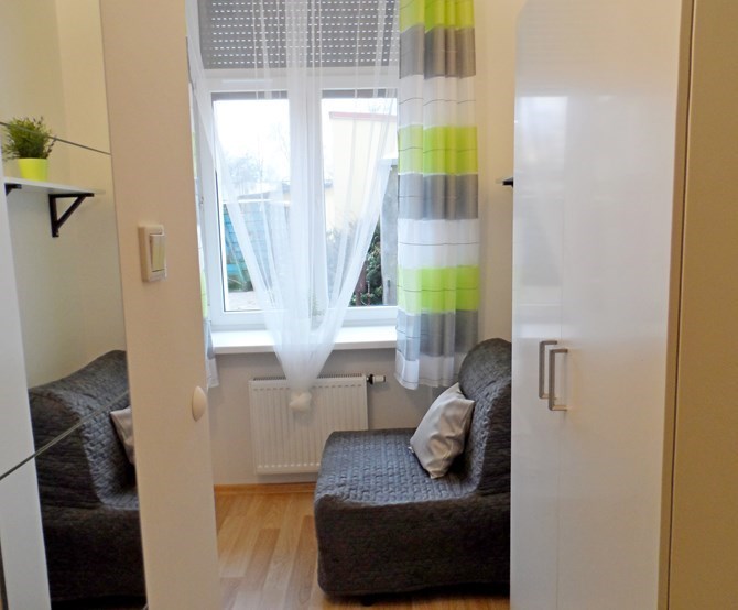 Pokój: rozkładana jednoosobowa sofa, krzesło, szafa, półka.