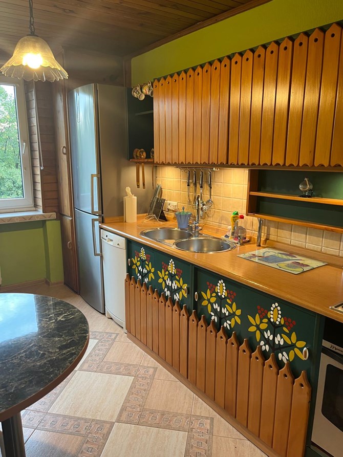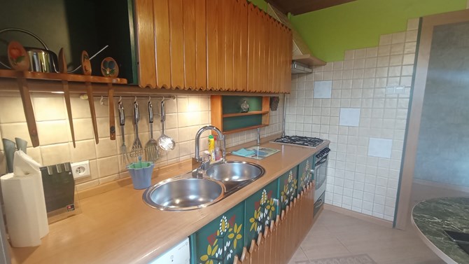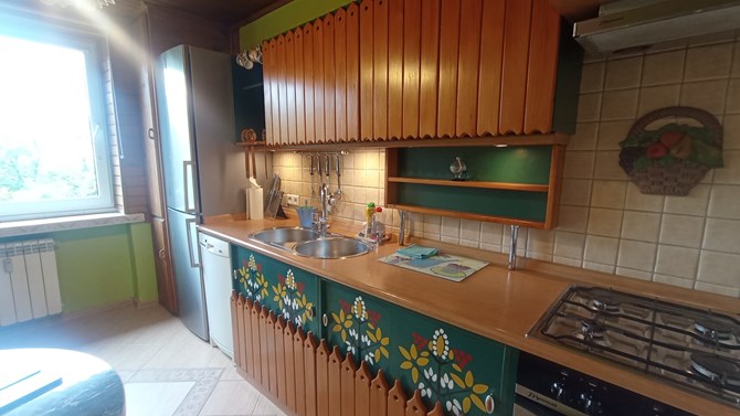 Kuchnia: szafki stojące i wiszące w zabudowie, lodówko-zamrażarka, okap, płyta gazowa, zmywarka, piekarnik, zlewozmywak.