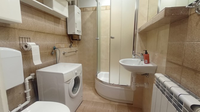 Łazienka: pralka, kabina prysznicowa, umywalka, szafka, WC.