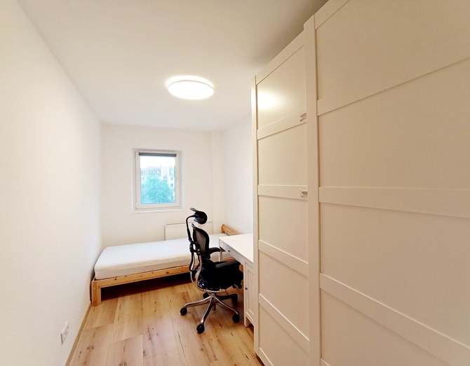 Pokój nr 3: pojedyncze łóżko z materacem, biurko, krzesło obrotowe.