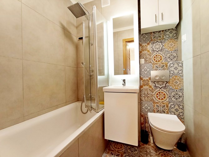 Łazienka: wanna z funkcją prysznica, WC, umywalka.