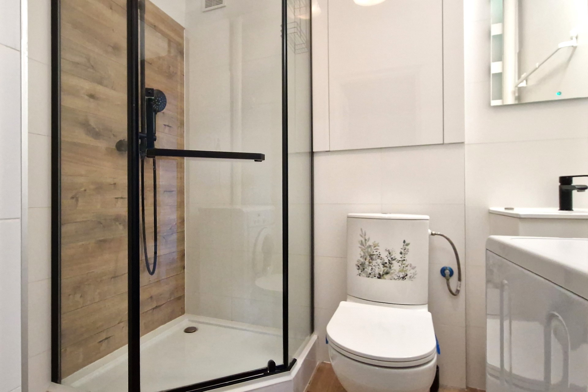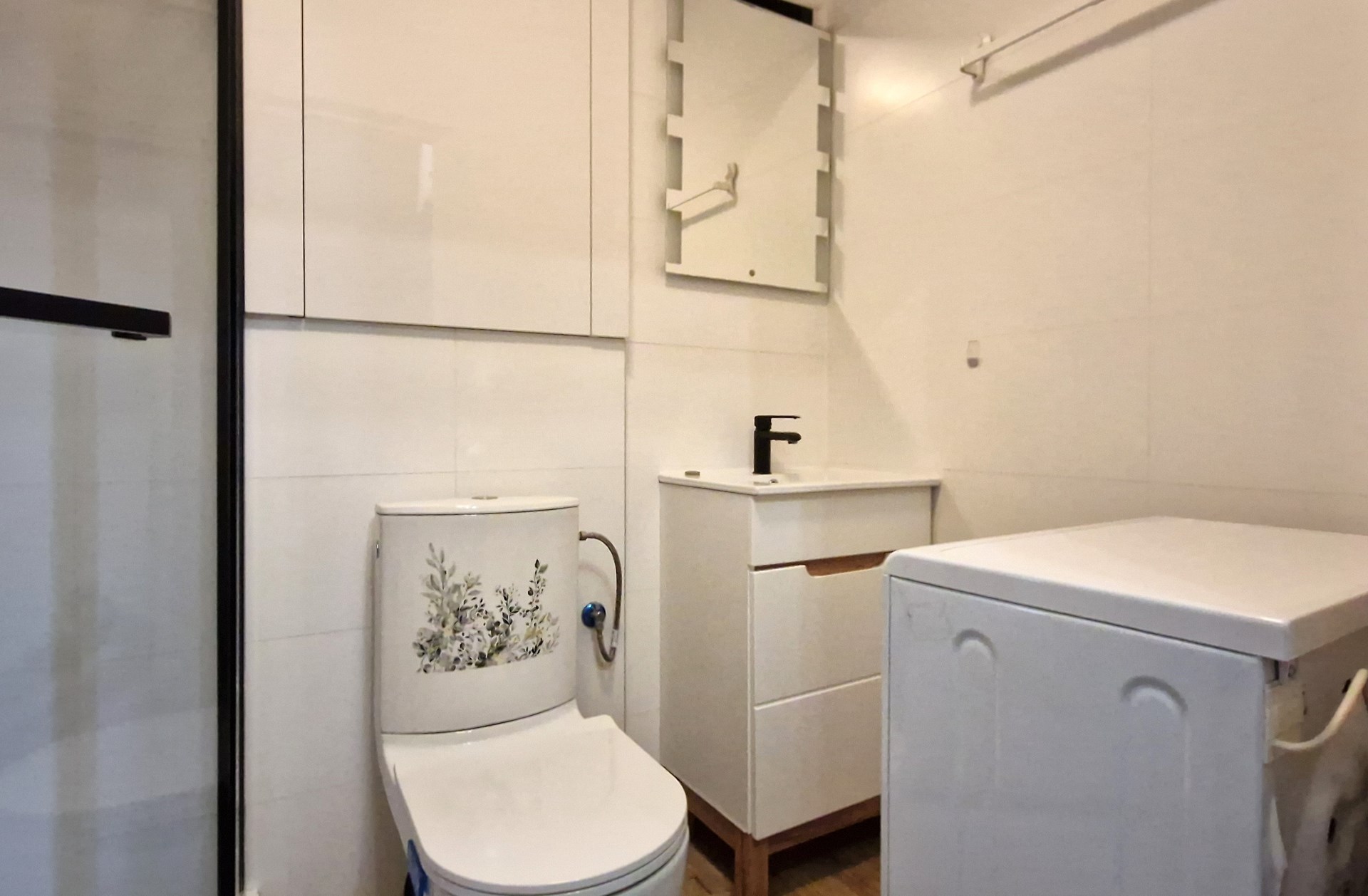 Łazienka (razem z WC): pralka, kabina prysznicowa, umywalka, lustro, szafki.