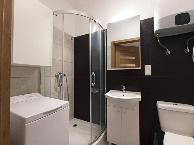 Łazienka: kabina prysznicowa, pralka, WC, umywalka.