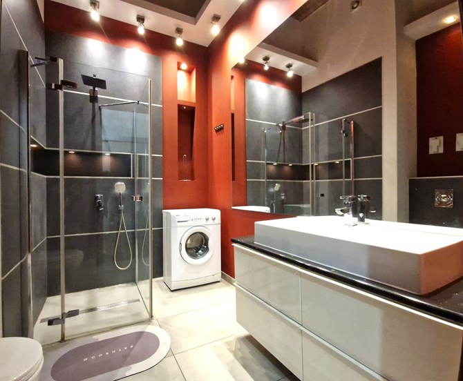 Łazienka: przestronny prysznic, umywalka, WC, pralka, szafki.
