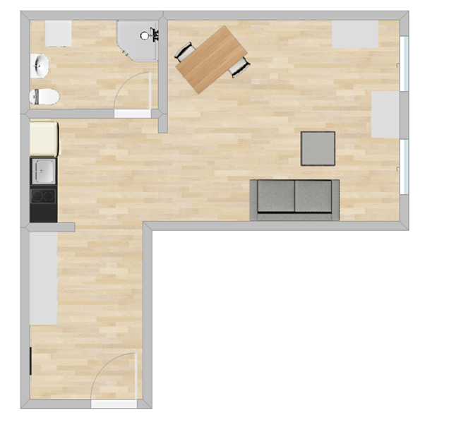 Funkcjonalna kawalerka z dobrze zaaranżowaną przestrzenią dzienną.