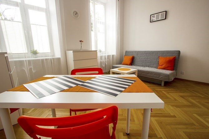 Salon: dwuosobowa rozkładana sofa z pojemnikiem na pościel, duża szafa, pojemna komoda, stół z dwoma krzesłami.