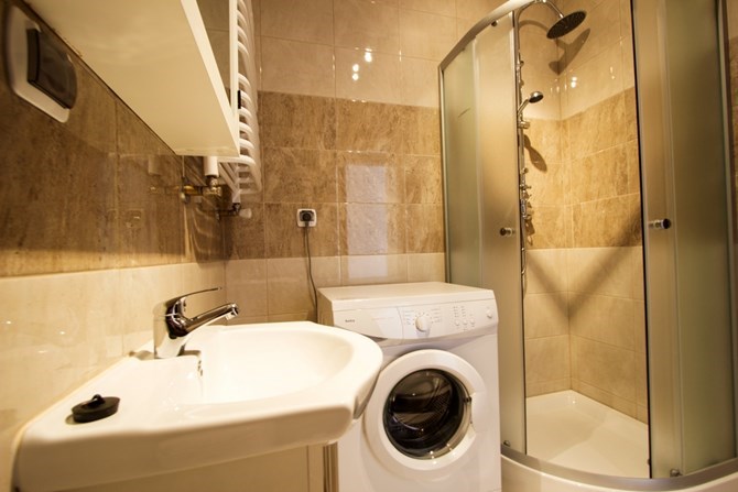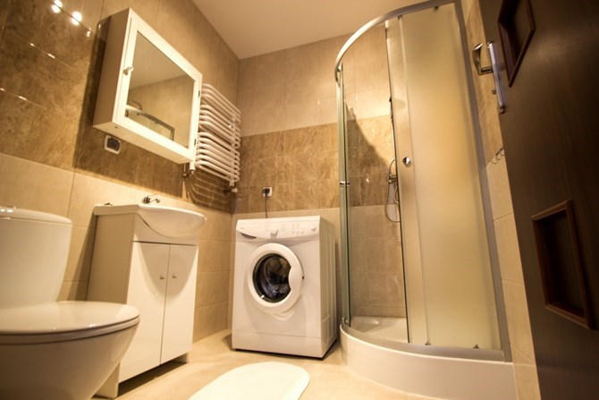Łazienka (razem z WC): kabina prysznicowa z deszczownią, pralka, kompakt WC, umywalka na szafce stojącej, szafka wisząca z lustrem.