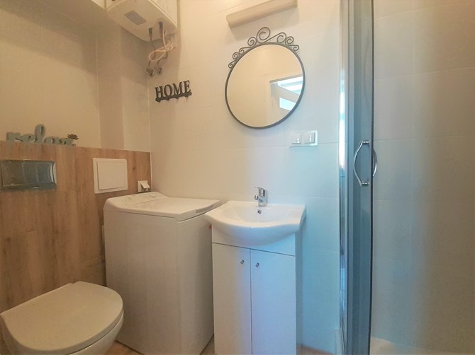 Łazienka z WC: kabina prysznicowa, umywalka, lustro, pralka.