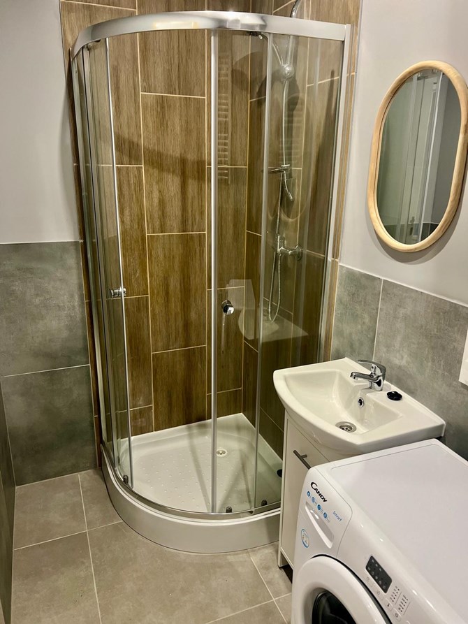 Łazienka z WC: kabina prysznicowa, szafka, lustro, pralka
