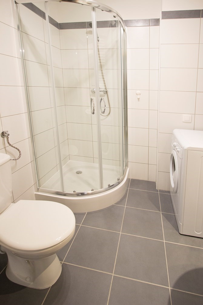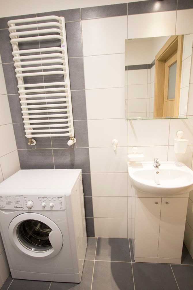 Łazienka: lustro z półką, kabina prysznicowa, pralka.