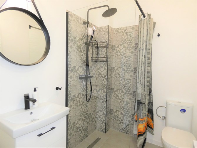 Łazienka: umywalka z szafką, lustro, prysznic, pralka, WC.