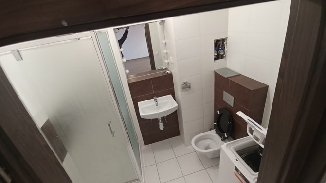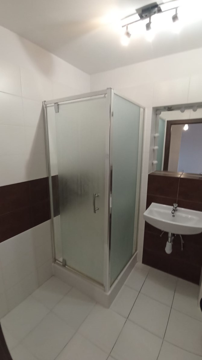 Łazienka: kabina prysznicowa, umywalka i pralka, WC.