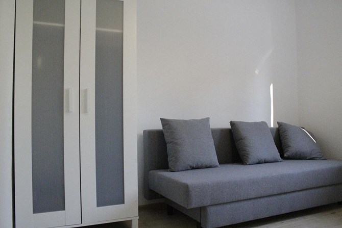 Pokój nr 1: rozkładana sofa, pojemna szafa, biurko.