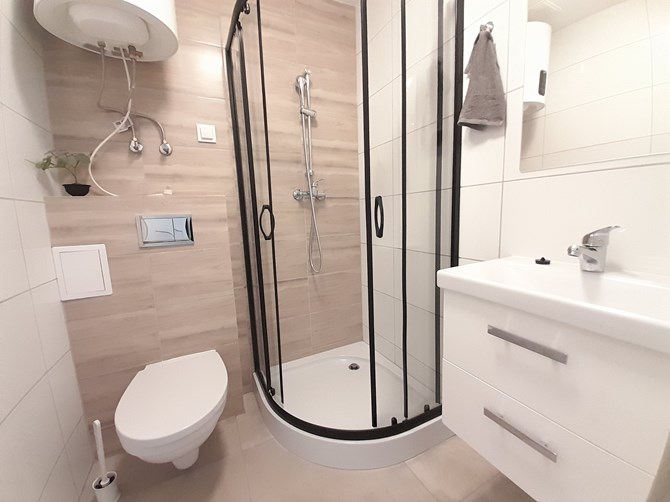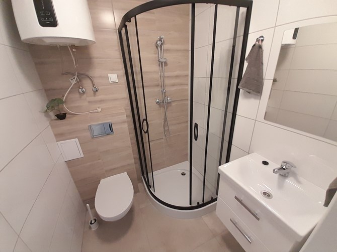 Łazienka z WC: kabina prysznicowa, umywalka, szafka, lustro