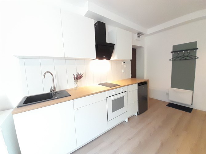 Aneks kuchenny: szafki, płyta elektryczna, piekarnik, lodówka
