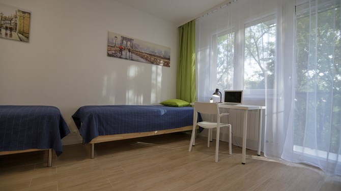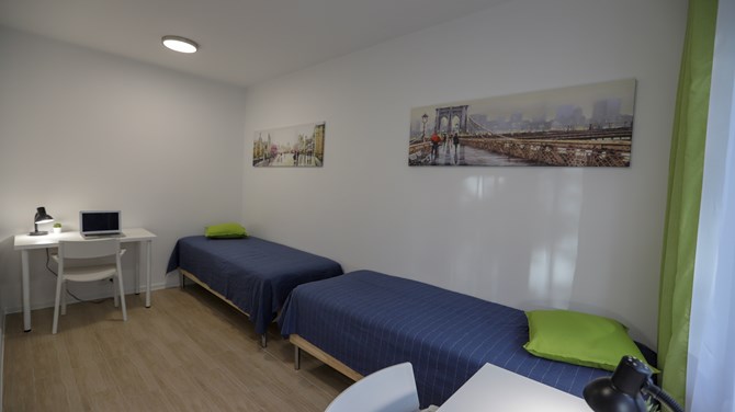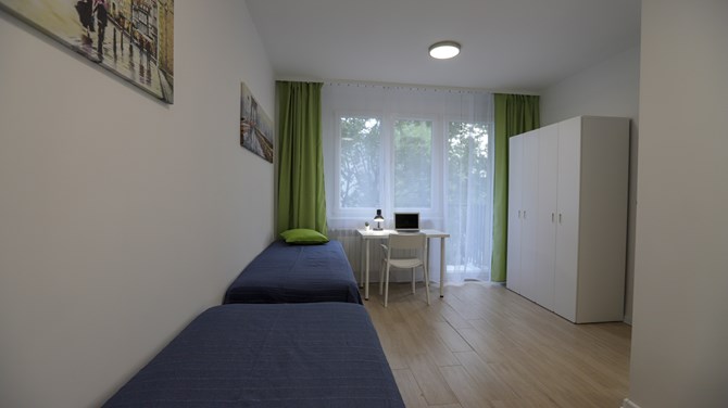 Pokój: 2 × łóżko pojedyncze z materacem, 2 × szafa, 2 × biurko, 2 × krzesło, 2 × lampa, szafka.