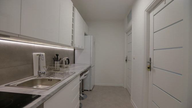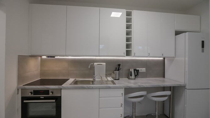 Kuchnia: lodówko-zamrażarka, płyta elektryczna 4-palnikowa, piekarnik, mikrofalówka, okap, czajnik elektryczny, zlewozmywak, 2 × hoker.