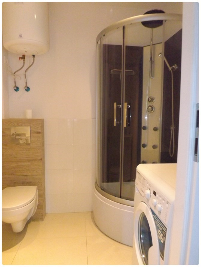 Łazienka z WC: kabina prysznicowa, umywalka, lustro, bojler elektryczny, pralka.